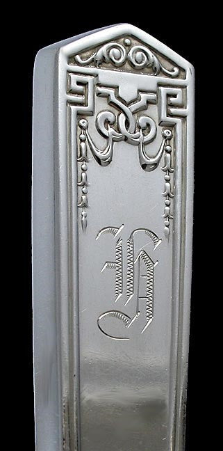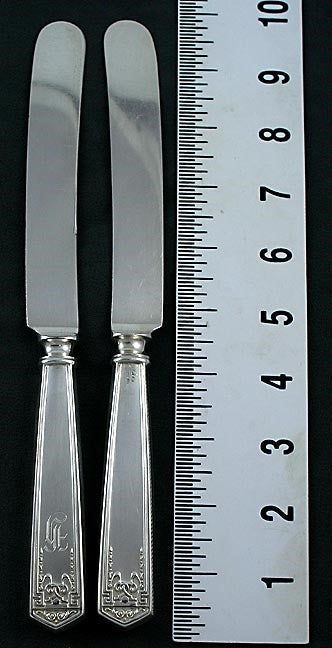 The knives are hallmarked on the handles with the maker’s mark for International and Sterling. The knives are in great overall condition. The silver plating on the carbon steel blades is in excellent condition. The knives have some surface wear commensurate with age and light use, and there are a few dings here and there, but this is minor. There are no splits, no breaks, and no repairs.