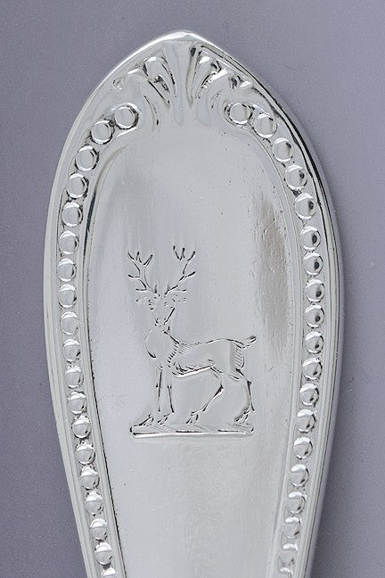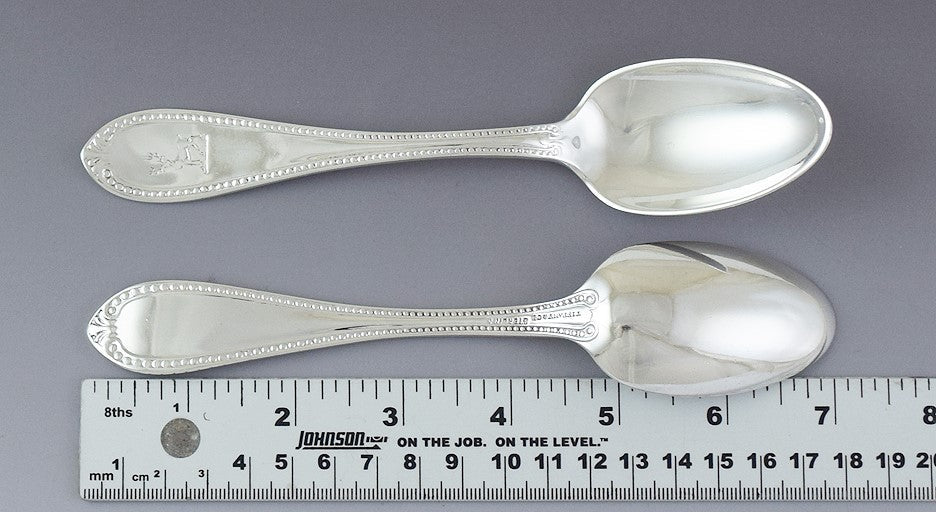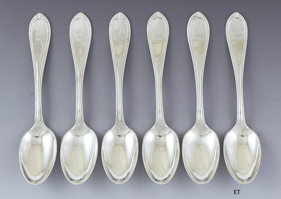 Presented is a great set of 6 Tiffany & Co sterling silver place, dessert, or oval soup spoons. These spoons are made in the Bead pattern, which began production in 1850 under John Polhemus, a renowned silversmith who designed and produced many much-loved silver patterns for Tiffany. These spoons date to around the 1850s-1860s. As the name suggests, this is a stylish beaded pattern with a foliate design at the tip of the handle. The pieces are well made from thick, heavy gauge silver, with a nice feeling of weight and balance in the hand. Each spoon has a finely engraved crest of a stag on the handle.