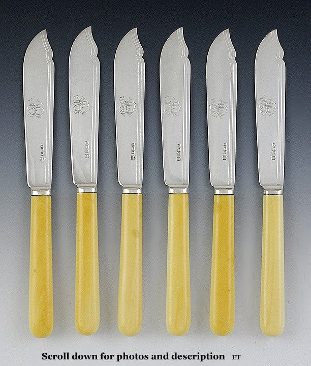 6 Antique 1893 Victorian English Sterling Silver Fish Dessert Knives 8.75"