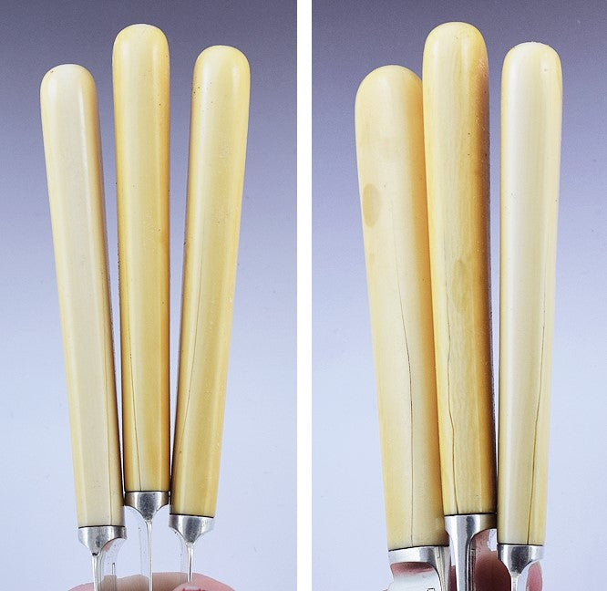 This set is in great overall condition. The handles all have a vertical crack, as is to be expected considering age and material. The crack is on the sides of the handles, and don't really show when set on the table. This does not effect the useability or structural integrity of the knives whatsoever. Otherwise there are no problems, no chips, no separations between blade and handle, no monogram removals, and no repairs.
