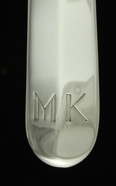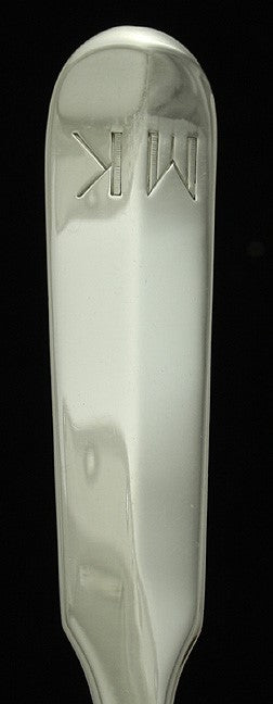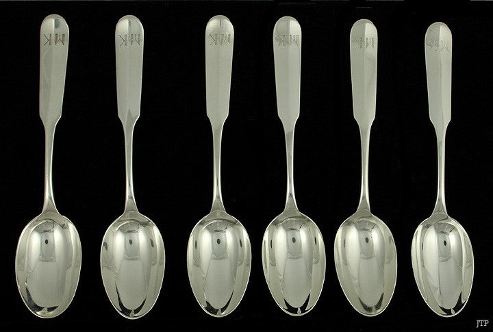 Presented is a great set of 6 Dutch sterling silver place spoons, dessert spoons or oval soup spoons. The spoons are nicely wrought in Dutch first standard 935 purity silver, a slightly higher silver purity than sterling silver. The spoons are done in a classic Fiddle pattern with a ridge down the center of the handle. The tips of the handles are engraved with MK in block script.