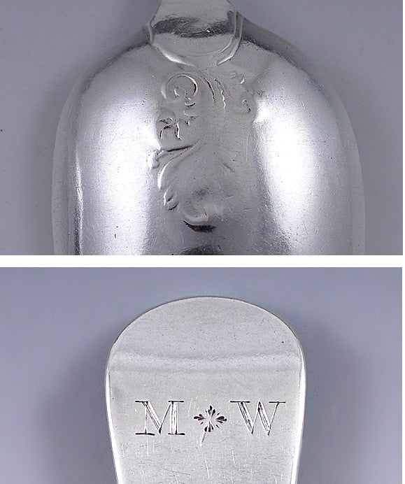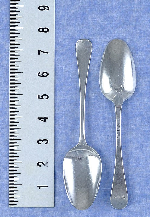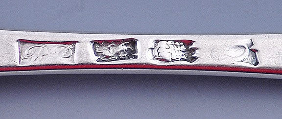 The back of each spoon is marked with the crowned leopard’s head for London, the lion passant for sterling silver, a date letter o for the year 1749 and a maker’s mark for Robert Perth. The date letter is only really visible on one of the hallmarks, the top of the o is visible and it corresponds perfectly with the date that Robert Perth is noted as working in London: 1748-1754.