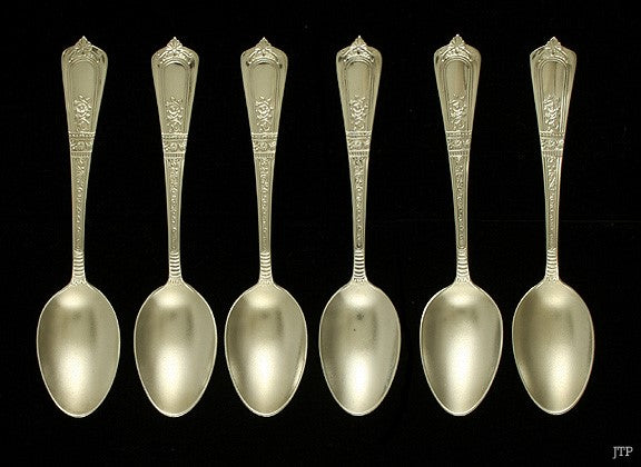 Presented is a nice set of 6 sterling silver demitasse spoons made by Gorham Manufacturing Company. The spoons are done in the Domestic pattern which was first produced in 1881. Each spoon is engraved ‘Rice’ on the backs of the handles.