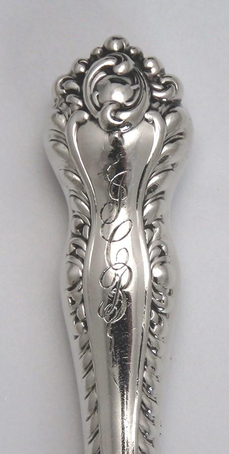 Presented is an old set of 6 sterling silver fruit knives made during the late 1800s or early 1900s by Dominick & Haff. This set is in the Mazarin pattern, which was patented in 1892. Each handle has a gadrooned edge and swirl designs surrounding a monogram of the initials JCB. This is an old set, as the blades are silver plated carbon steel.