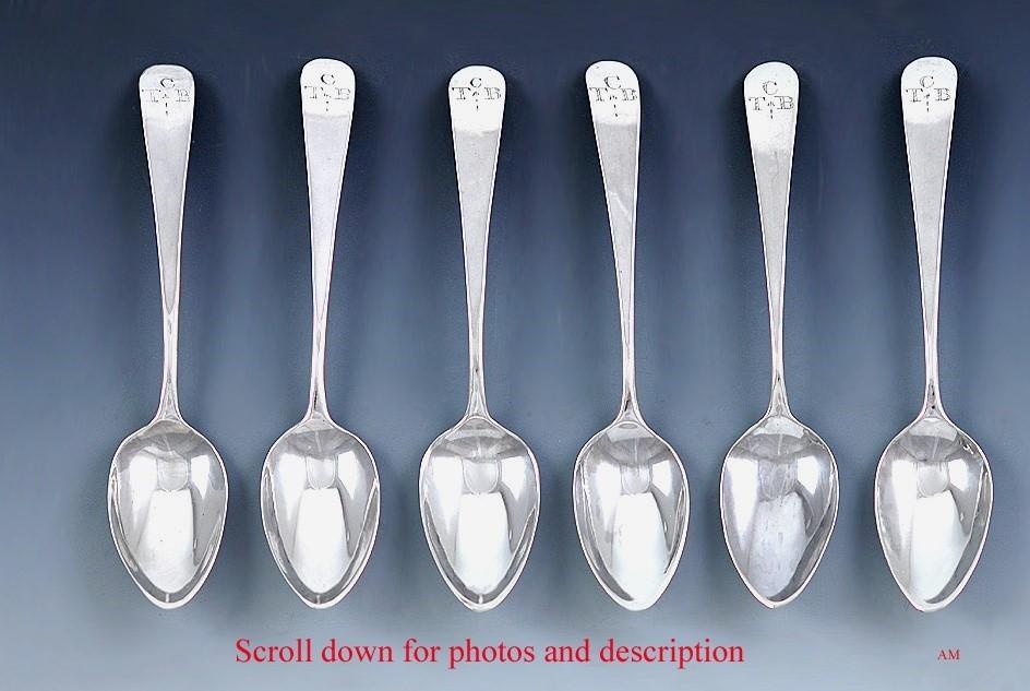 Presented is a set of 6 Georgian sterling silver demitasse spoons by Peter, Ann and William Bateman. The spoons are in the very nice Old English pattern. The spoons were made in London in 1803. The front of the handles are monogrammed with the initials C over TB.