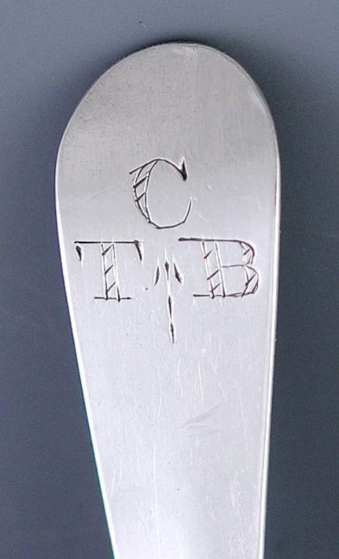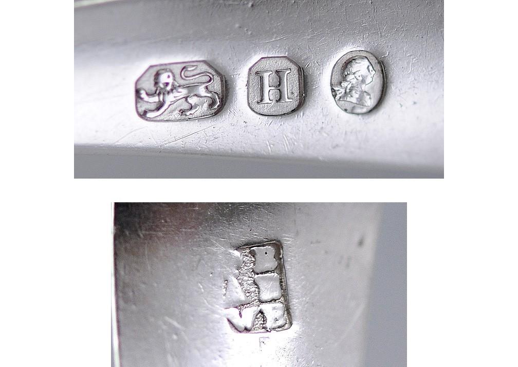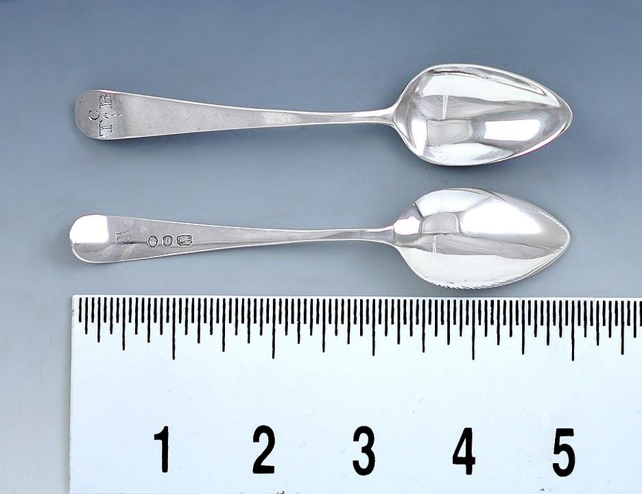 The spoons are marked on the underside with the lion passant for sterling silver, the leopard's head crowned for London, the duty mark of George III's head, the date letter H for 1803 and the maker's mark PB over AB over WB for Peter Bateman, Ann Bateman and William Bateman.