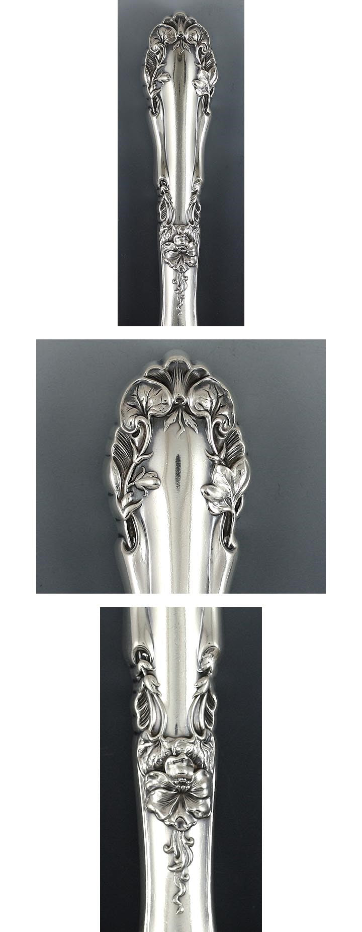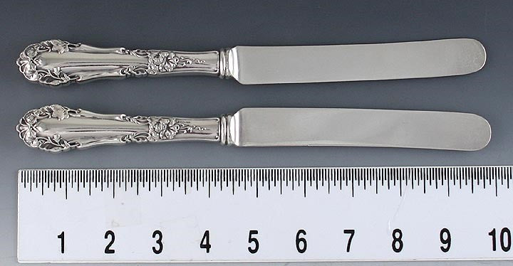 Presented is a set of 6 sterling silver huge dinner-size knives by International Silver Co. in the Marcell pattern, which was first introduced in 1907. The Marcell pattern is a lovely example of an Art Nouveau style floral pattern. These knives have the original old silver plated carbon steel blades. The silver plating on the blades is in superb condition and everything is useable.