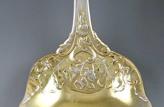 Presented is a very rare set of 6 Royal Oak Pattern sterling silver dessert or ice cream spoons by Gorham. The interior of the bowls and decorations on the backs of the bowls have a nice gold wash. All the spoons are marked on the underside of the handle with the the patent year of 1902. These spoons were likely made within 5-6 years of the patent date, or between 1902-1908. Each spoon is monogrammed with the letter M on the front in old English or Gothic script. This is an extremely hard to find set, very heavy and of fabulous quality.