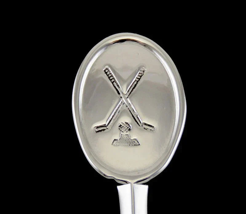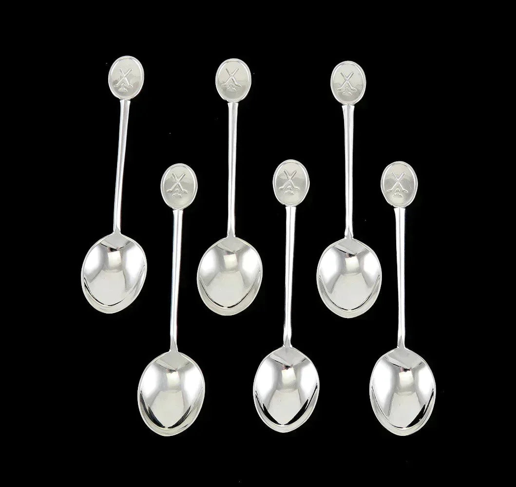 Presented is a vintage set of 6 sterling silver demitasse spoons made by Cooper Brothers & Son Ltd of Sheffield, England in 1965. This set is done in a Medallion top form. The top of each handle is hand engraved with a pair of golf clubs over a ball and tee.