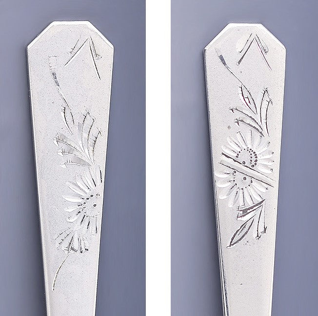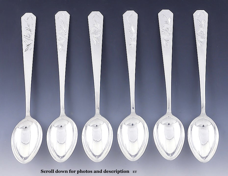 Presented is a fabulous quality set of 6 high purity Korean silver spoons. These spoons are a good size for demitasse or coffee spoons. The spoons have a lovely bright cut design of sunflowers or daisies on the handles, and a bright mirror finish everywhere else. These are good quality, well made silver pieces, clean and ready to grace your home.