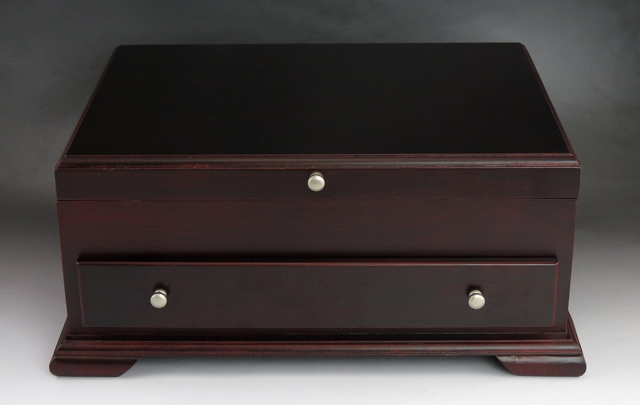 We are including with the set a brand new fitted storage chest, as seen in the photos. The chest is wood in a rich dark walnut finish, with a velvet lined interior.