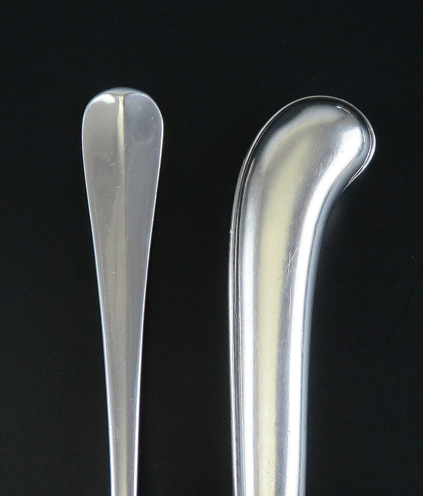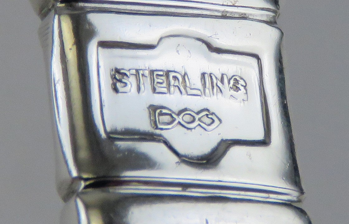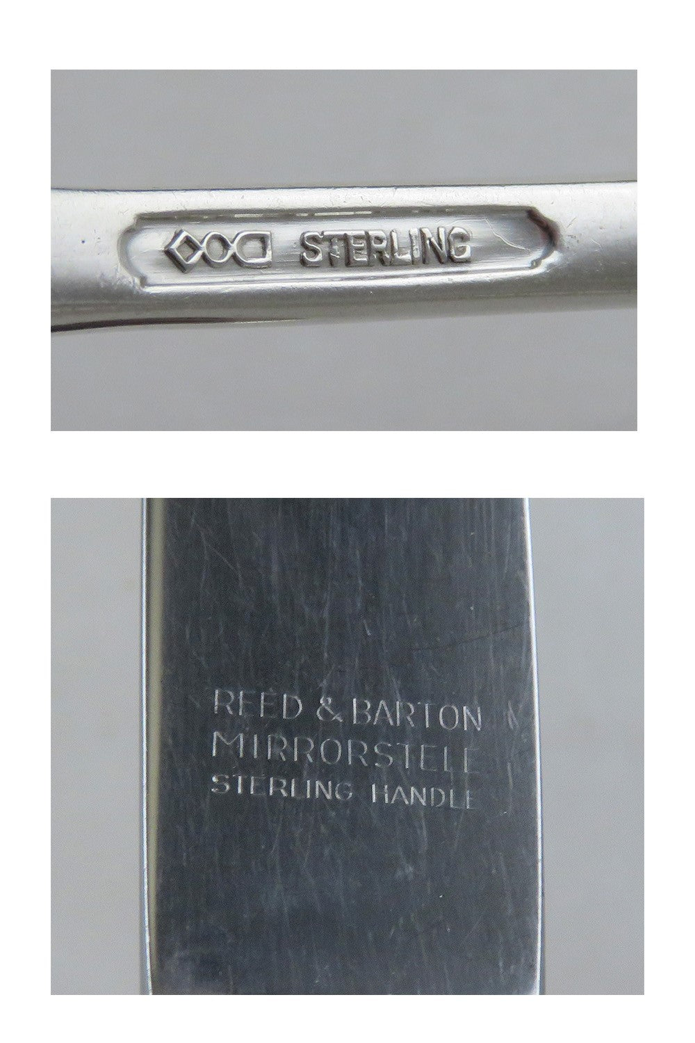 Each non-knife piece is stamped with the Dominick & Haff maker's mark as well as sterling. The knives are marked Reed & Barton although they are made in an identical pattern, as well as 'sterling handle' and Mirrorstele, Reed & Barton's proprietary stainless steel.
