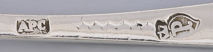 The two smaller spoons have older Portuguese hallmarks, a P crowned for the city of Oporto guaranteeing a silver purity of 958, used between 1853-1862, as well as a maker's mark of APC. Between these two marks on each of the two spoons is the typical mark left by the Portuguese assay, a long zigzag. The remaining five spoons each have a Portuguese hallmark of a boar's head in an octagonal punch above the Roman numeral II, guaranteeing 833 silver purity, used between 1886-1938. These five spoons also have a stamp in the shape of an urn or pitcher, which we do not recognize.