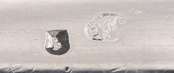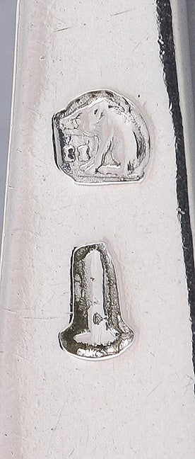 The six smaller spoons are hallmarked with the Portuguese seated boar mark for the city of Lisbon, guaranteeing a silver purity of 833, as well as an additional mark that is perhaps a maker's mark. The single larger spoon has two marks we unfortunately do not recognize.