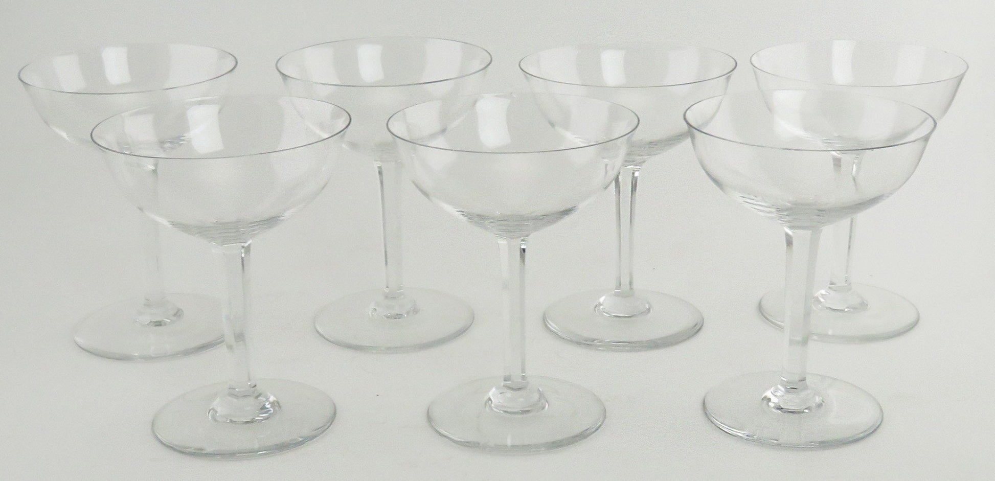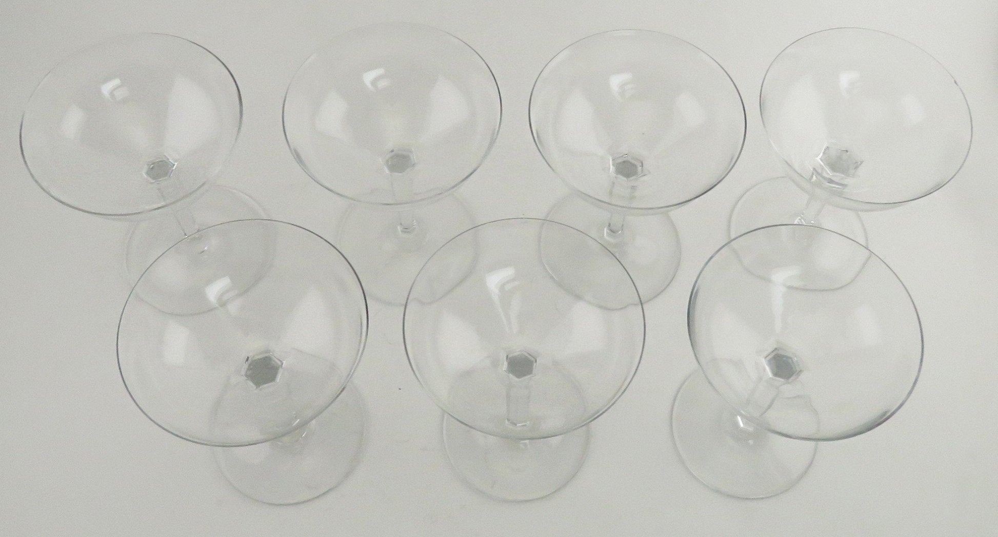 Presented is a fabulous set of 7 hand blown champagne glasses made by Baccarat of France. This set is in the Coppelia pattern, which was in production between 1931 and 1970. The glasses have a neat hexagonal stem.