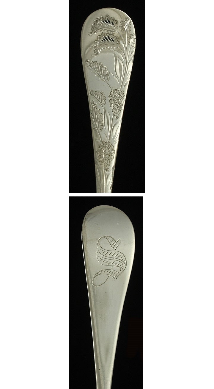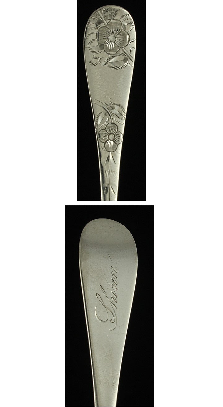 Presented is a great set of 7 sterling silver bright cut teaspoons. Three of the spoons are made by Towle Silversmiths and done in the No. 43 pattern which was first produced in 1882. These spoons are engraved ‘Shinn’ on the reverse. The other 4 spoons are made by A. F. Towle & Son, an off shoot of Towle Silversmiths which was in business from 1890 to 1902. These spoons are engraved with bright cut flowers and leaves on the front of the handles and an S monogram in Gothic script on the back of the handles.