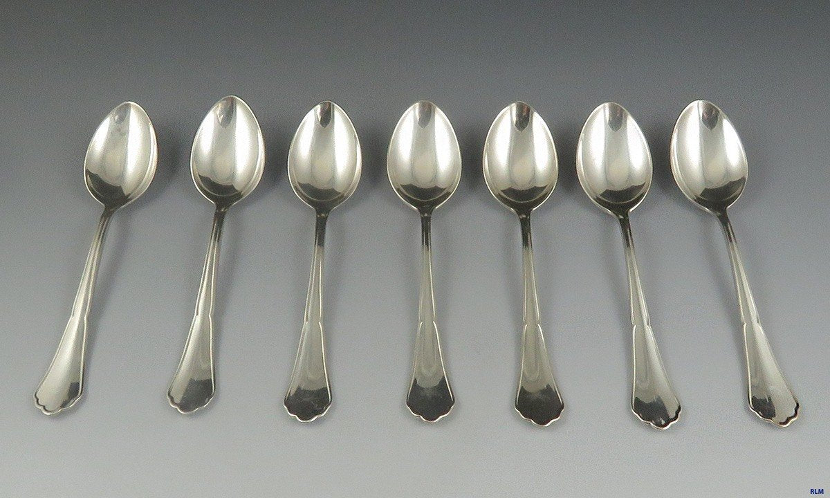 Presented is a fine set of 7 German silver demitasse spoons made by Bremer Silberwarenfabrik. This is a great set and the handles have never been monogrammed.