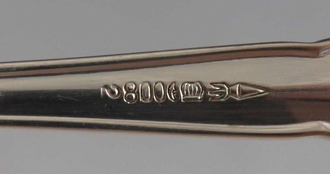 The back of each piece is marked with one of Silberwarenfabrik’s hallmarks, the German crown and crescent mark and 800 for the silver purity.