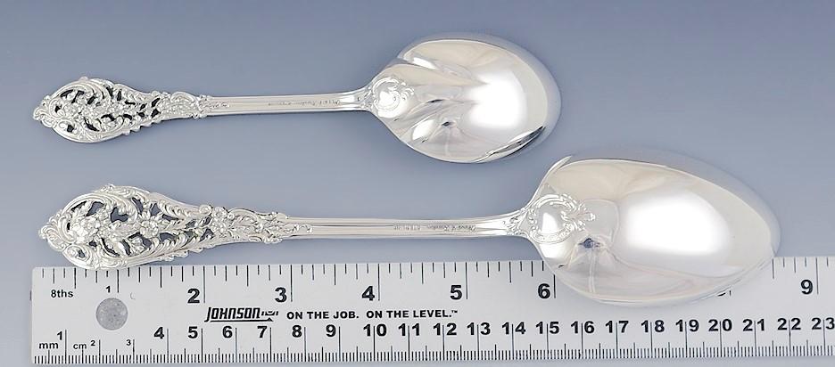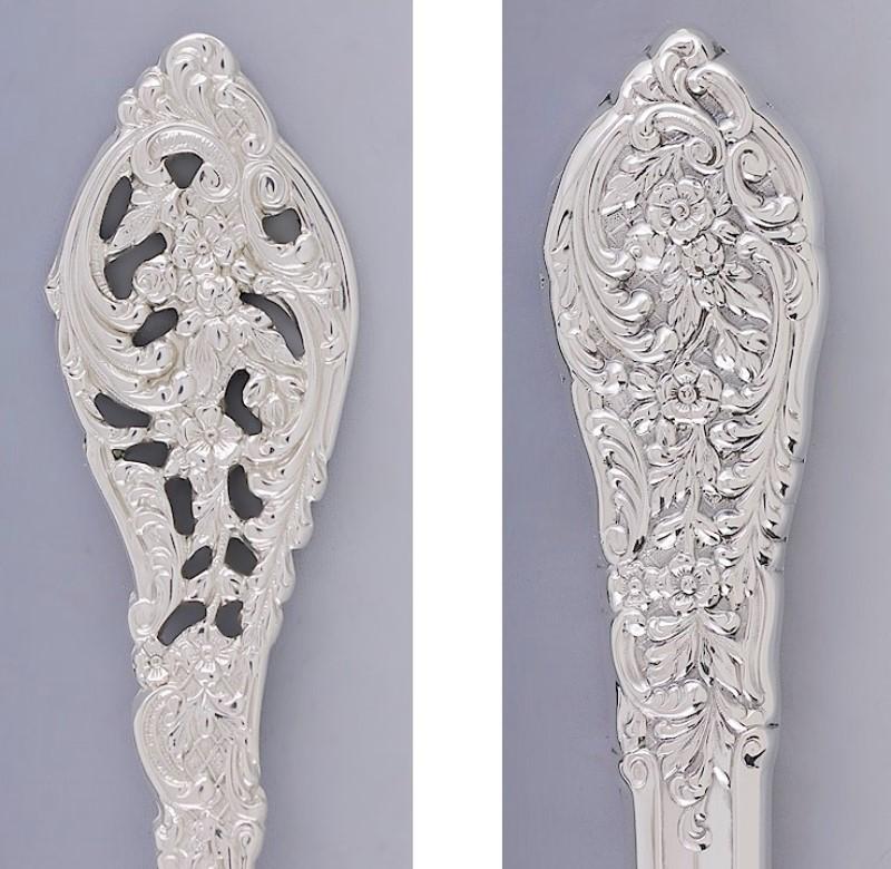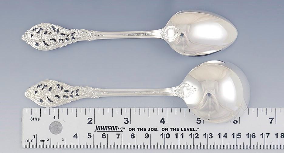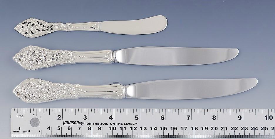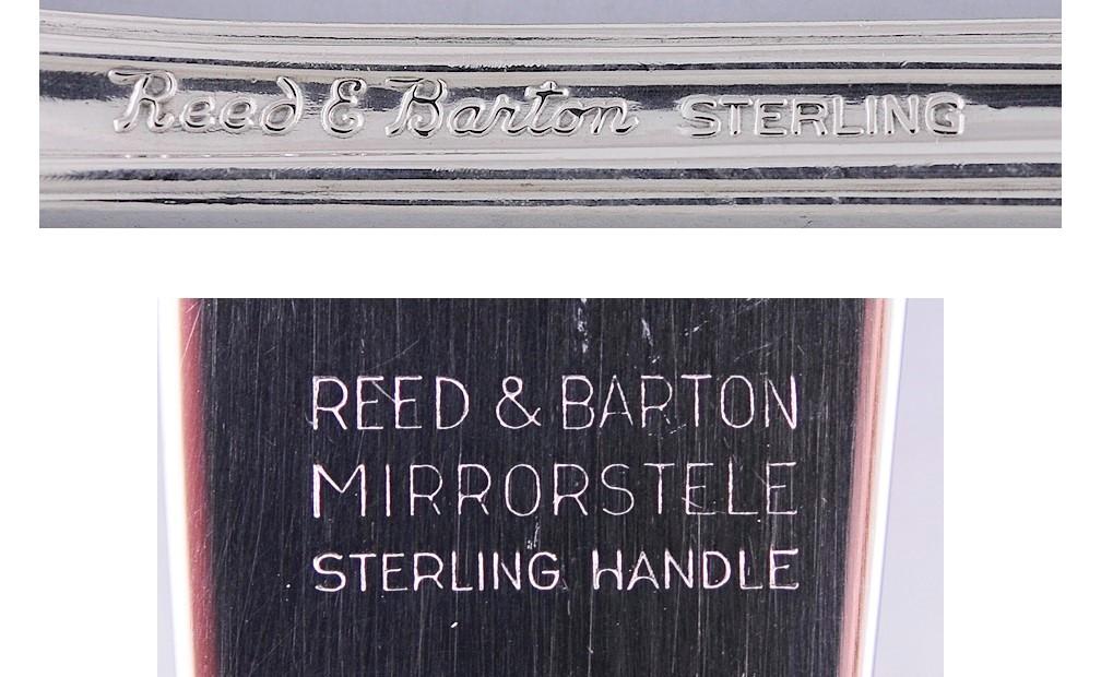 The pieces are stamped with the Reed & Barton maker's mark as well as sterling. The blades of the knives are marked Reed & Barton, Mirrorstele (Reed & Barton's proprietary stainless steel) and sterling handle.