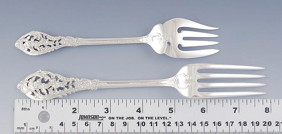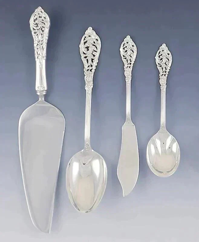 The set weighs 2927 grams or 103.2 regular ounces, NOT including the knives and pie server due to their stainless steel blades. Since the knives do have sterling silver handles, there is even more than this gram weight worth of sterling silver in the entire set.