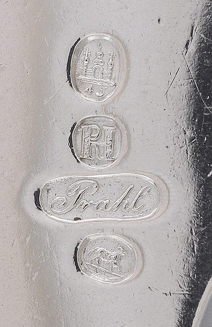 Each spoon is stamped with the Danish hallmark for the city of Copenhagen, with 45 underneath for the year 1845. This mark guarantees at least 826 purity silver. Beneath that are the conjoined initials RH for R. Hinnerup, assayer between 1840-1863. The 'Prahl' stamp is the maker's mark for Jacob S. Prahl. We don't recognize the stamp beneath the maker's mark.