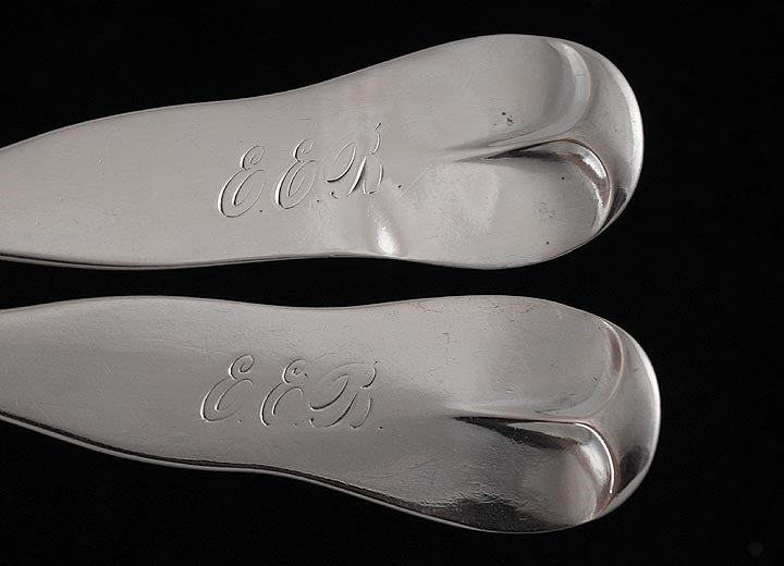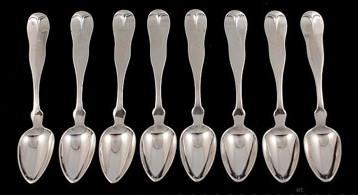 Presented is an old set of 8 coin silver teaspoons made by Gorham during the 1850s. Each spoon has a monogram of the initials EEB on the front.