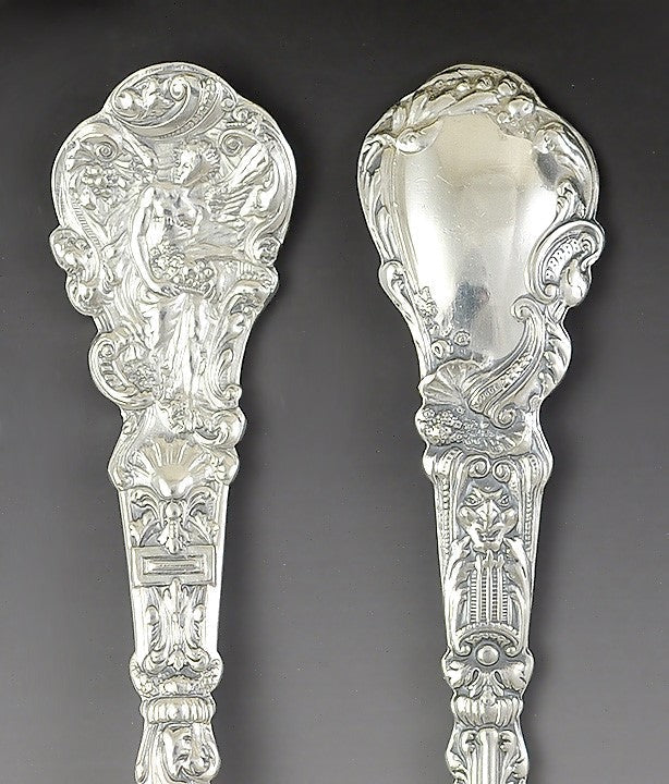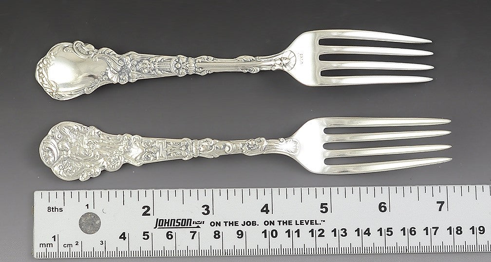 One of the forks is more visibly worn, and has older hallmarks, but is still in great overall condition with no bends, no breaks, no monograms, no monogram removals, and no repairs. The rest of the set have very crisp patterns with no bends, no breaks, no monograms, no monogram removals and no repairs.