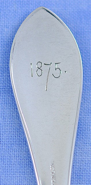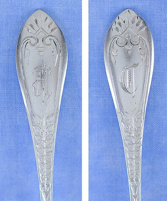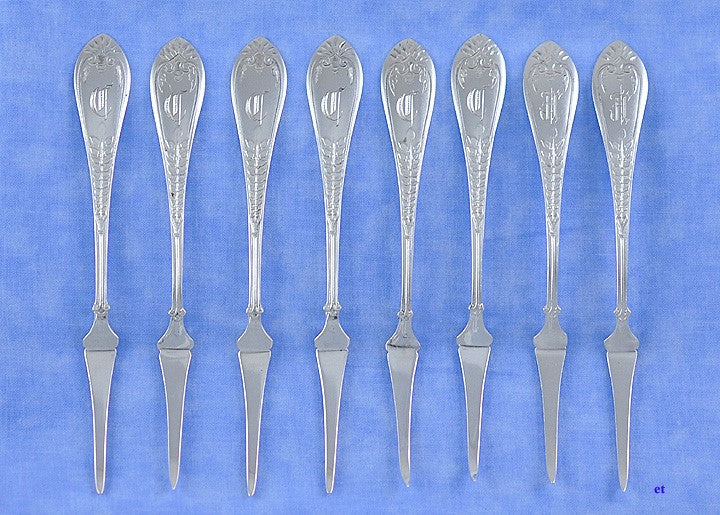 Presented is an attractive set of 8 old sterling silver nut picks by the Gorham Manufacturing Company. The picks are done in the elegant Palm pattern which was first produced in 1871. The handles are covered with a very fine matte finish on the front. The lobster picks were made between 1871-1875. The back of the picks are beautifully engraved with leaves and scrolls. Six of the picks are monogrammed on the front with the letter C in Gothic script and on the back with 1875. The remaining two picks are monogrammed on the front with the letter H in Gothic script.