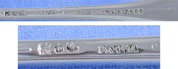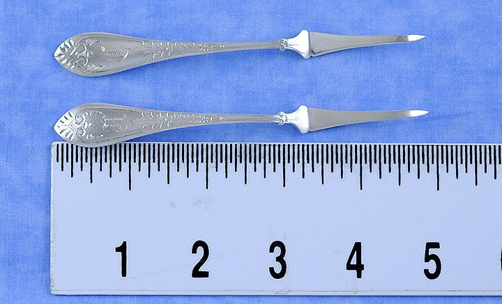 The picks are marked on the reverse with Gorham’s old company hallmarks, Sterling for the silver purity, Pat 71 for the date 1871 when patented, and the retailer's mark.