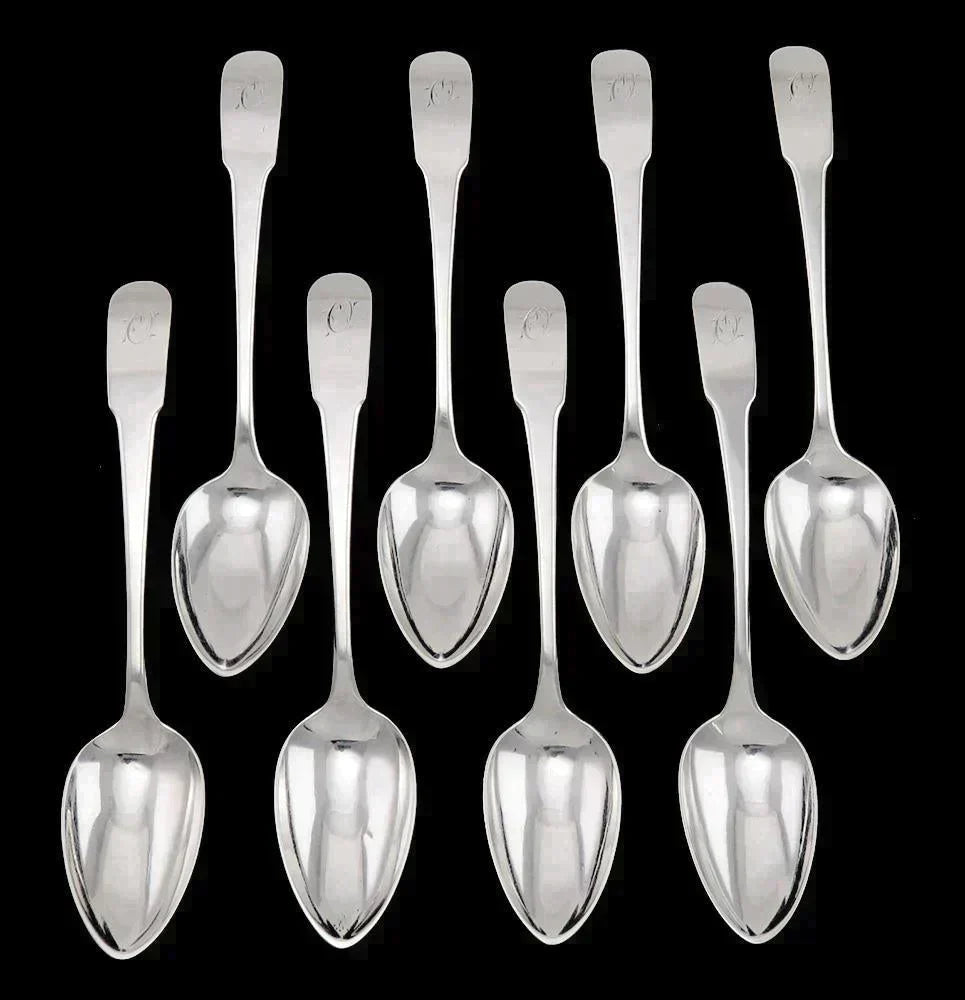8 Antique Early 19th Century American Coin Silver Dessert/Soup Spoons 7 3/8”