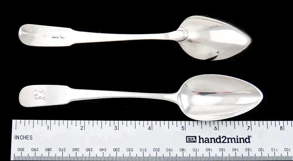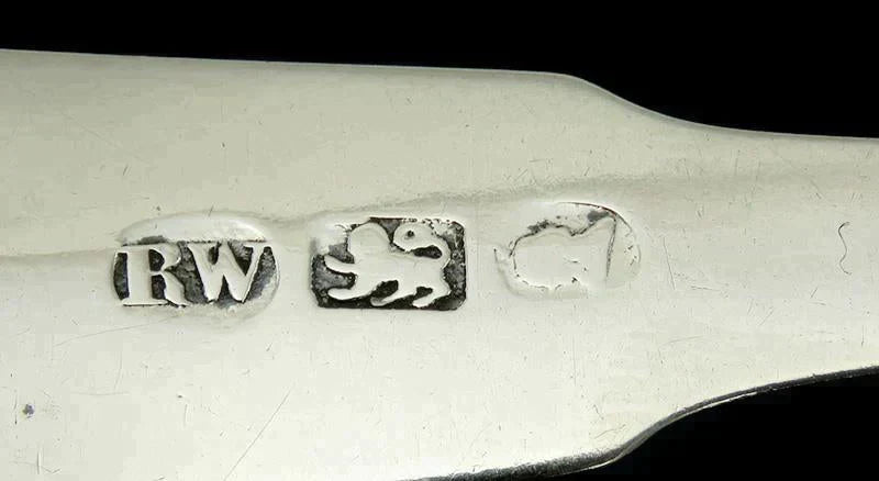 The back of each spoon has a maker's mark for Robert Wilson. This exact mark is illustrated on John McGrew's American coin silver book being used between 1803 to 1810.