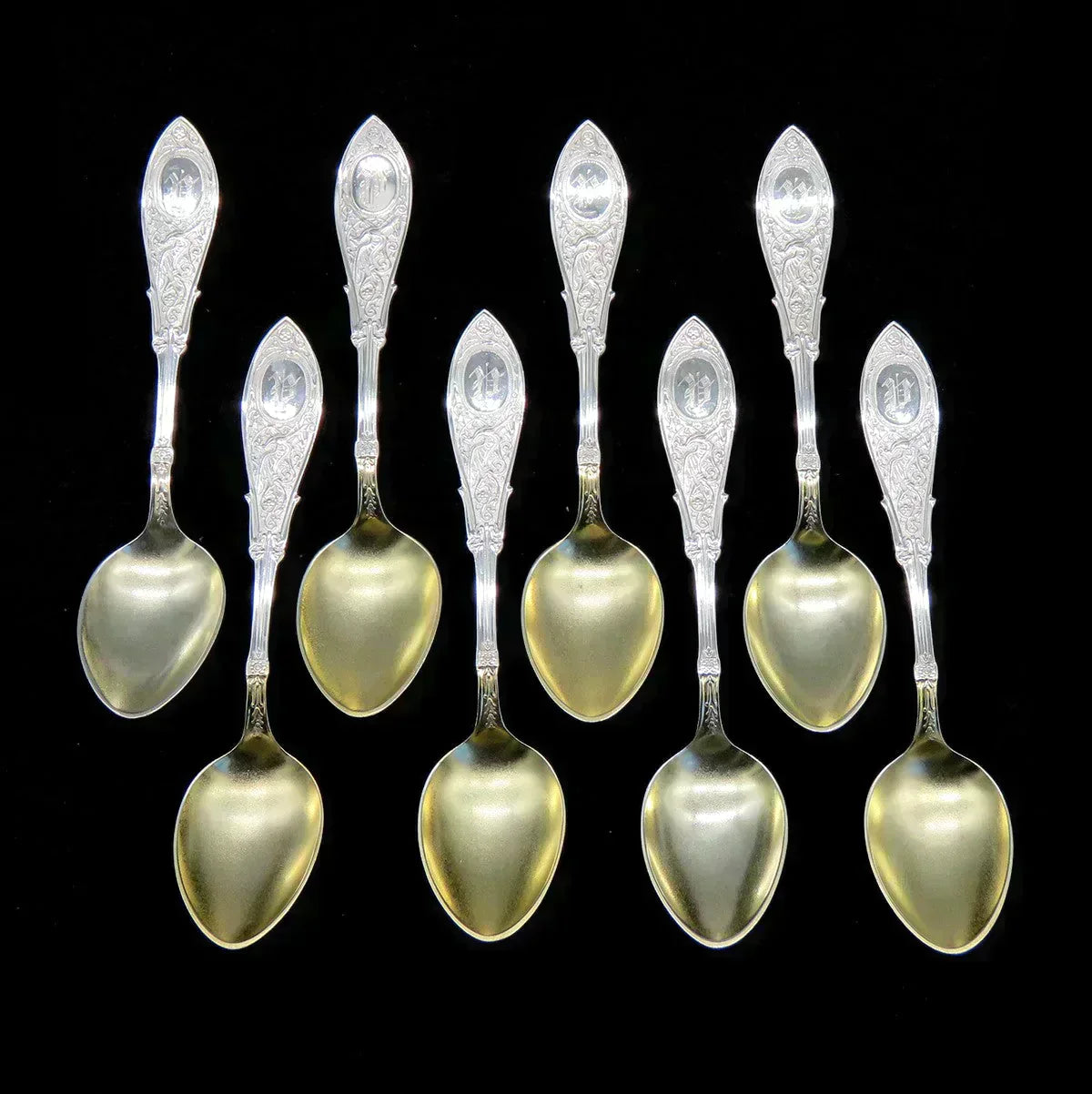 8 Antique Mint Sterling Silver Whiting Arabesque 1875 Gilt Bowl Demitasse Spoons