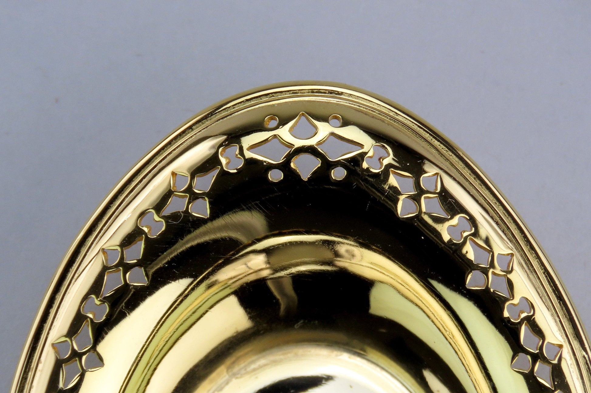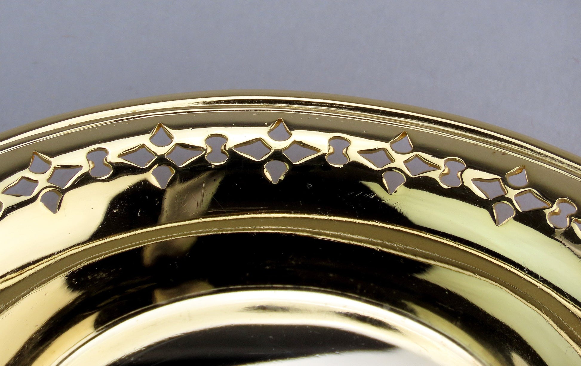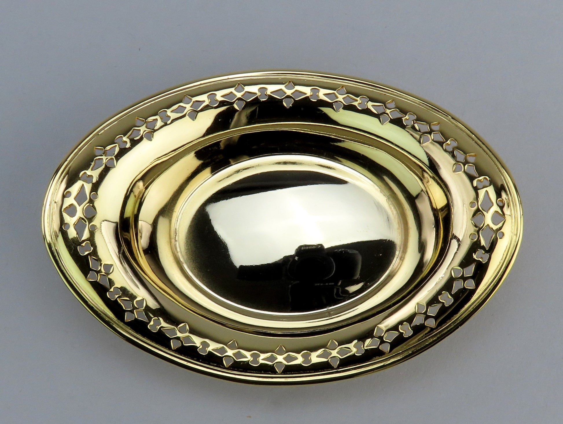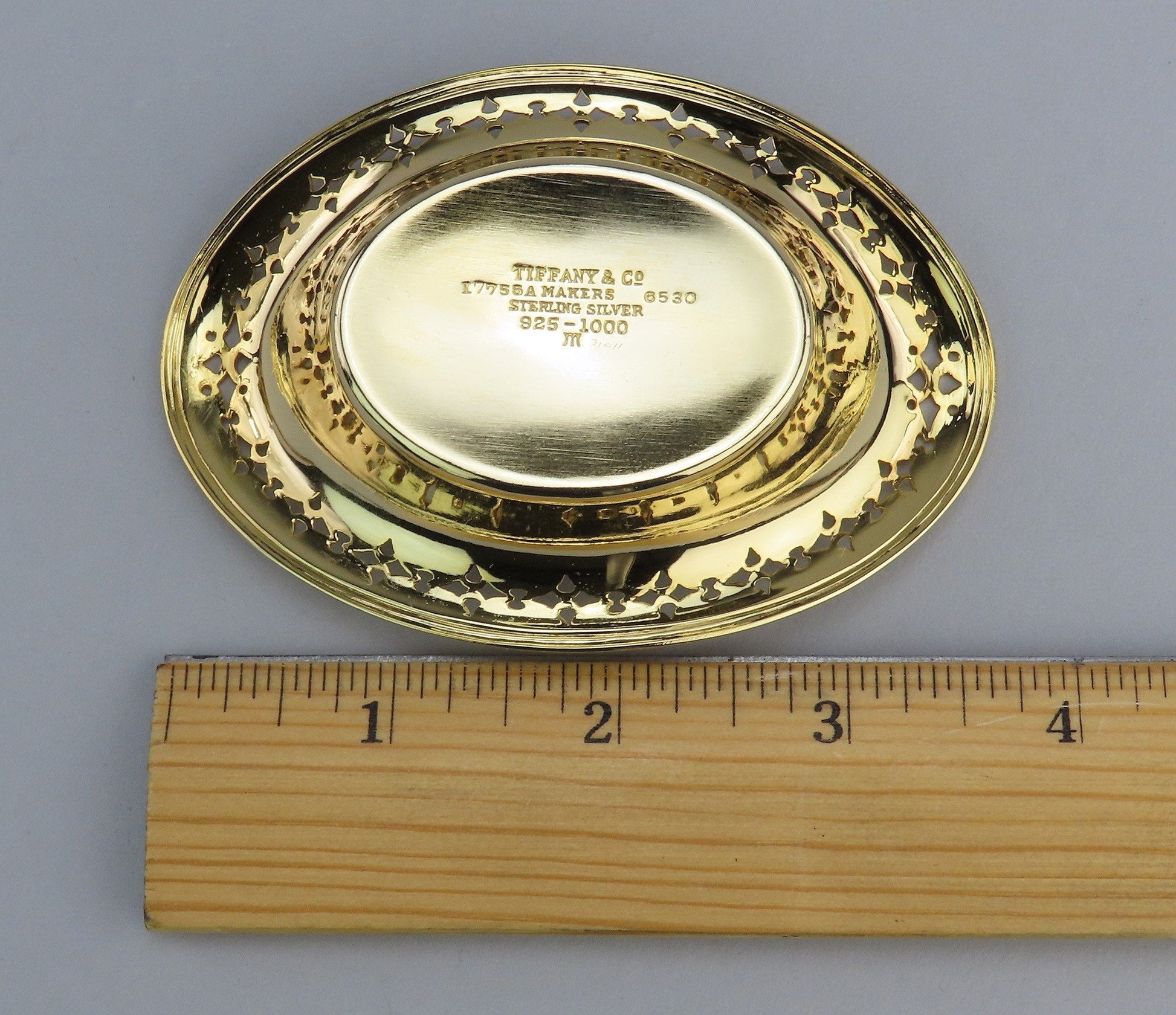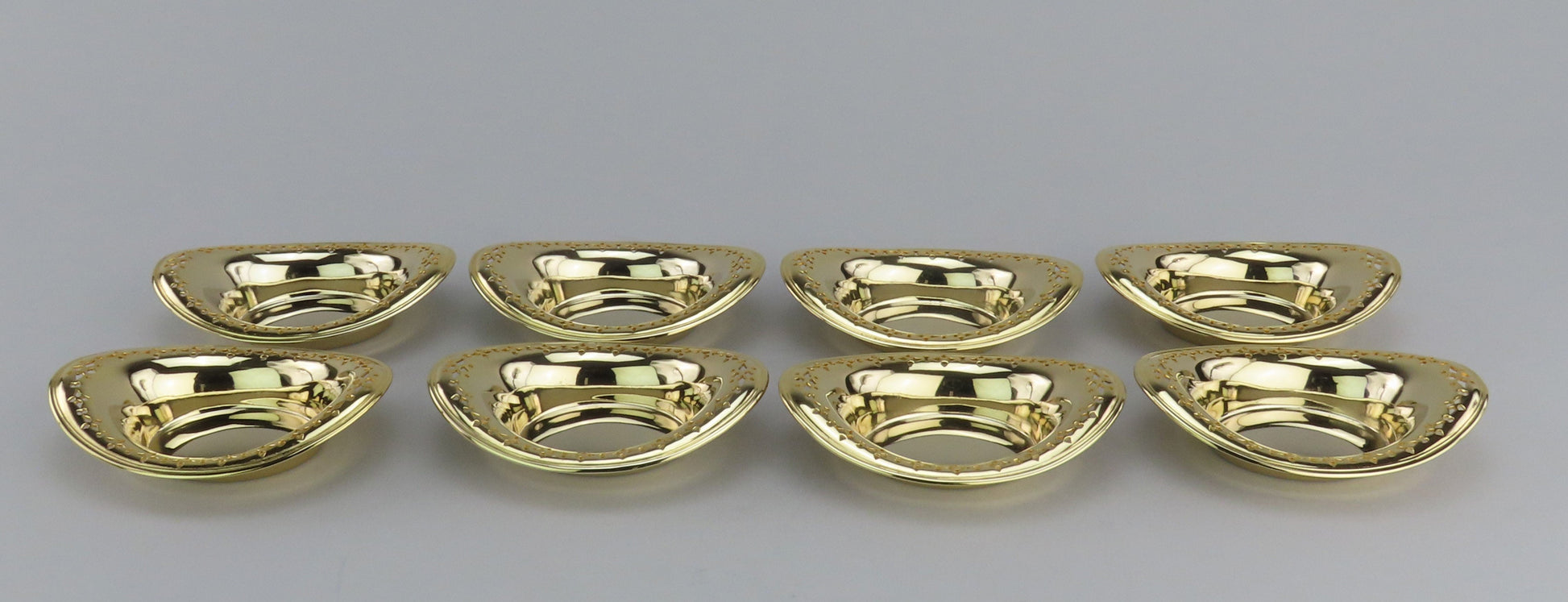 Presented is a gorgeous set of 8 Tiffany & Co sterling silver small nut or candy dishes. This set displays a bright gilding on the entirety of each piece. The dishes have an oval shape and elegant pierced decorations made of triangles and diamonds around the border with a threaded edge. The set appears close to a mirror finish and is free of monograms.