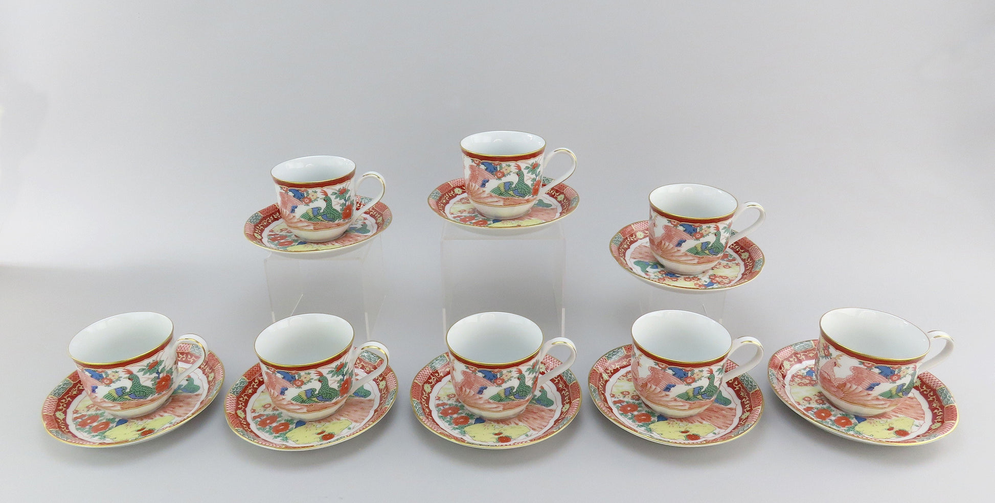 8 Large Cups and Saucers Gumps San Francisco Phoenix Bird 9639 Imari Style