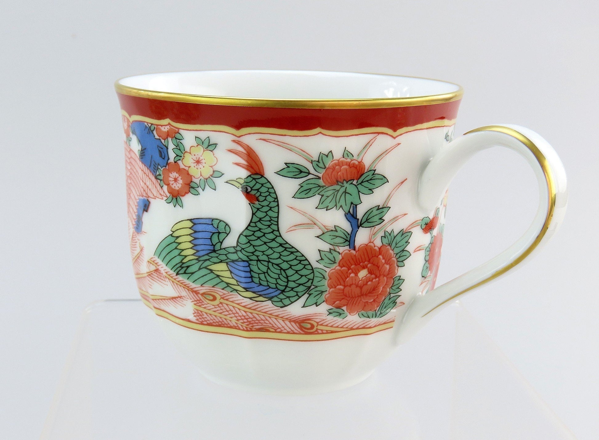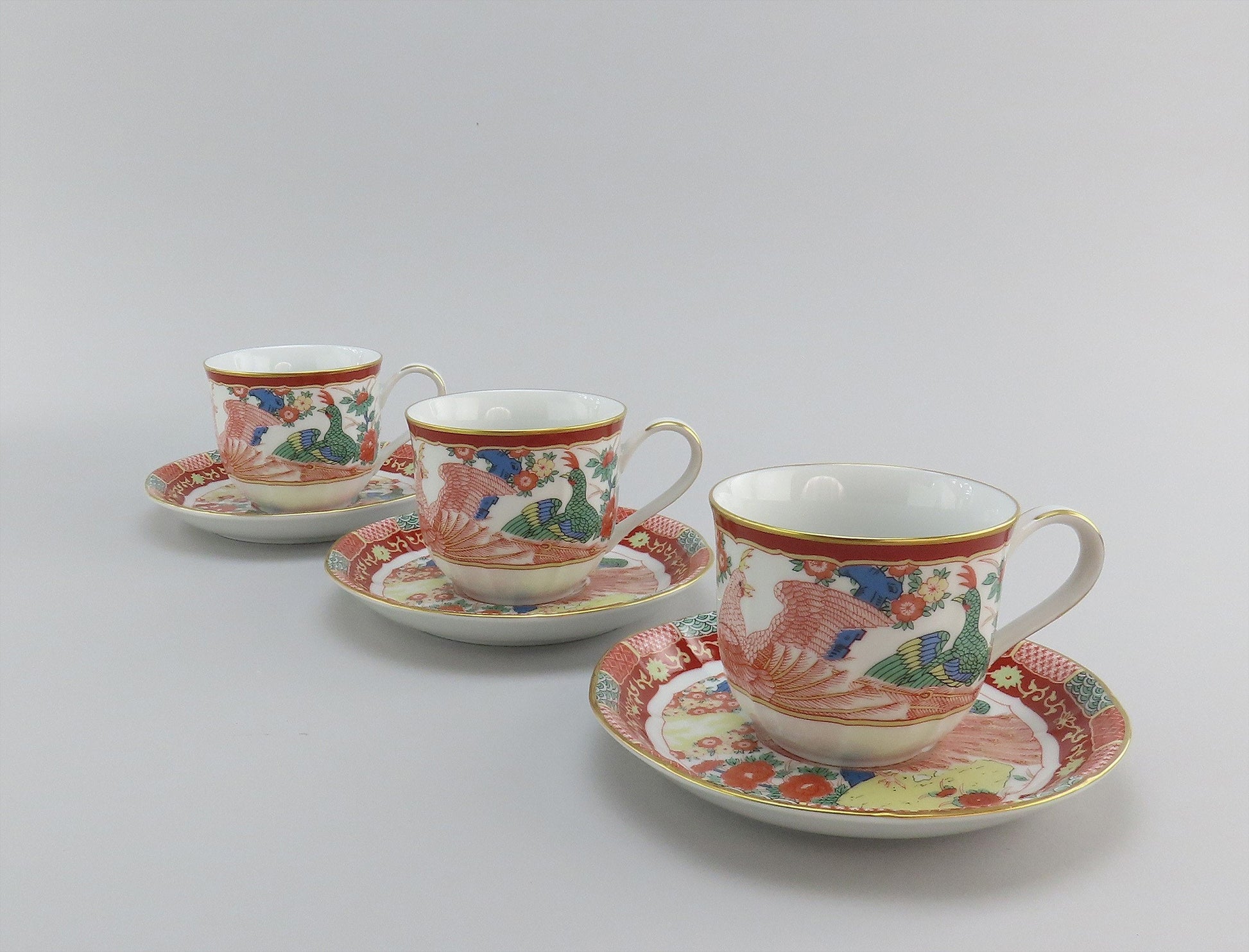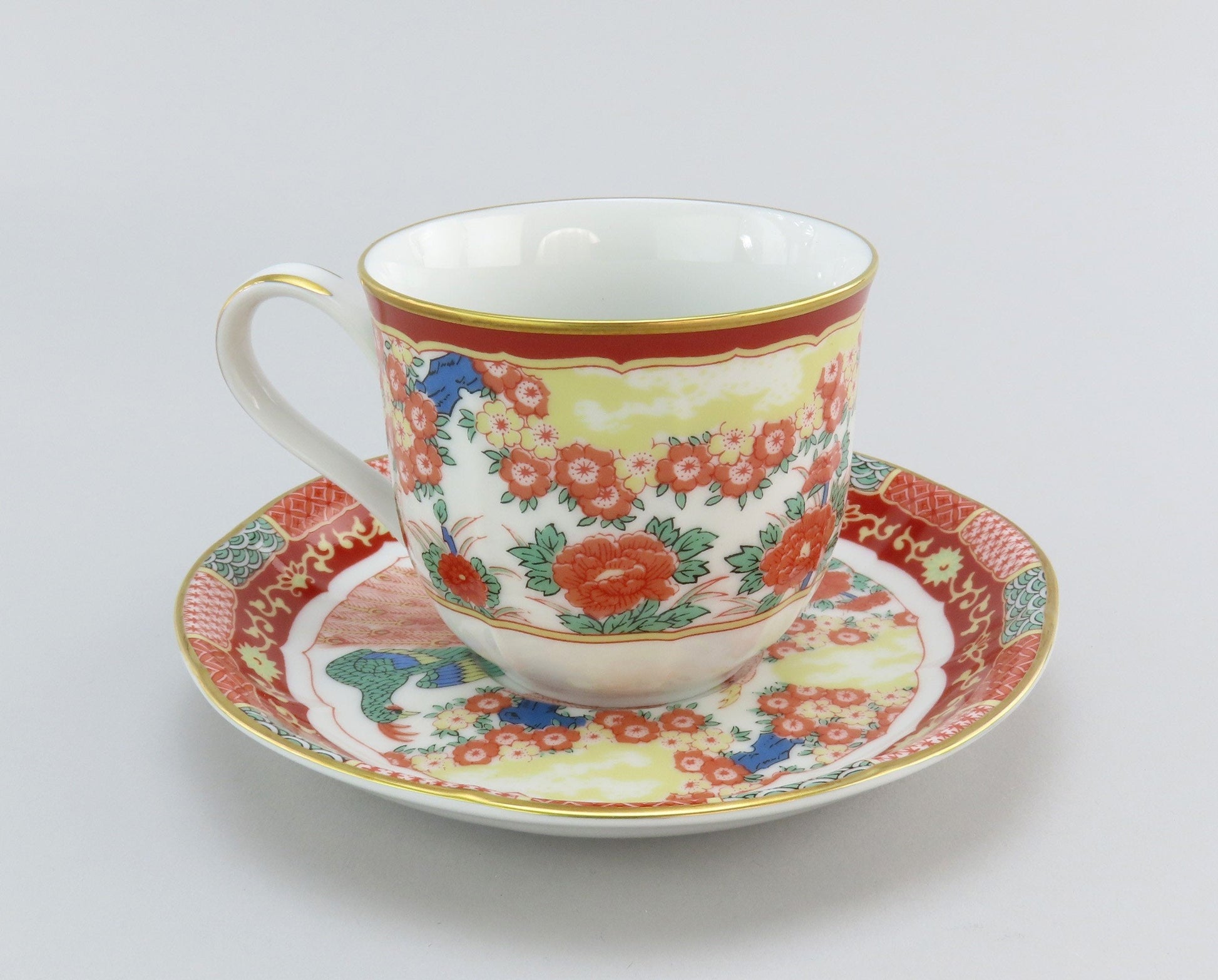 Presented is a fabulous set of 8 large cups and saucers from Gump's San Francisco. This set is in the Phoenix Bird pattern, which was likely in production during the 1990s. The pattern on the saucers displays two birds at the center surrounded by multicolored flowers and a red border with red and green patterned rectangles around the rim. The cups have the center bird decoration around the exterior. Both cups and saucers a soft scalloping detail with bright gilded edges.