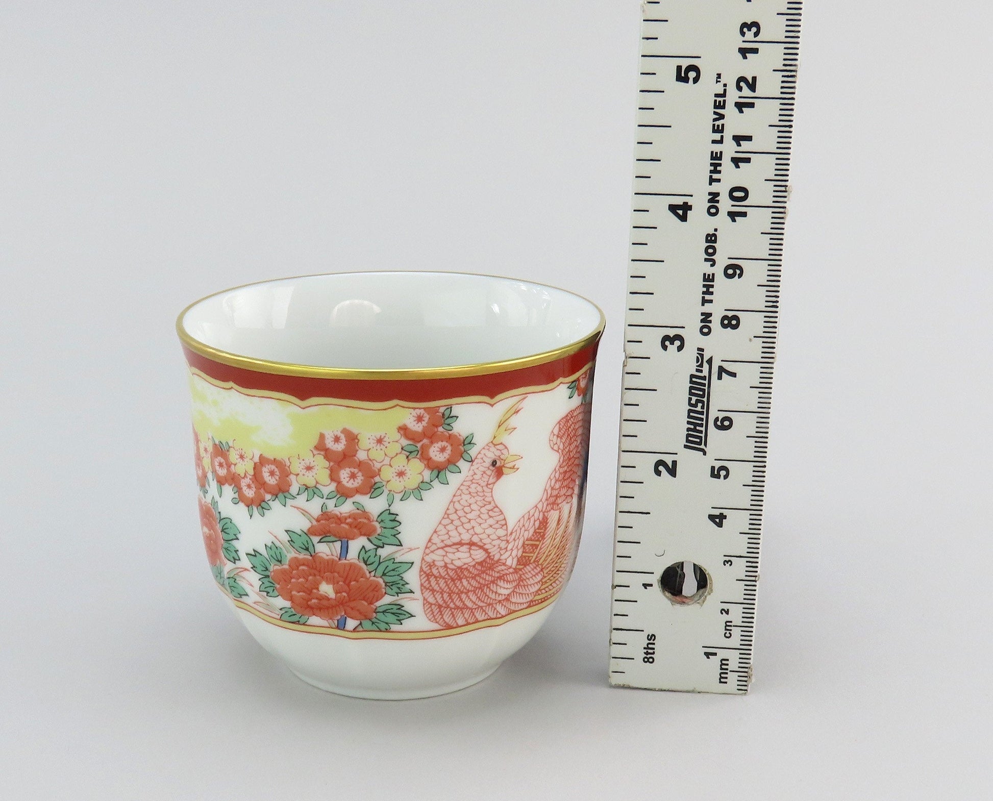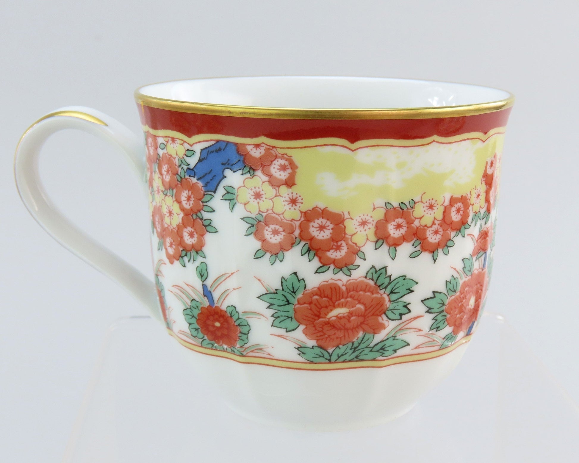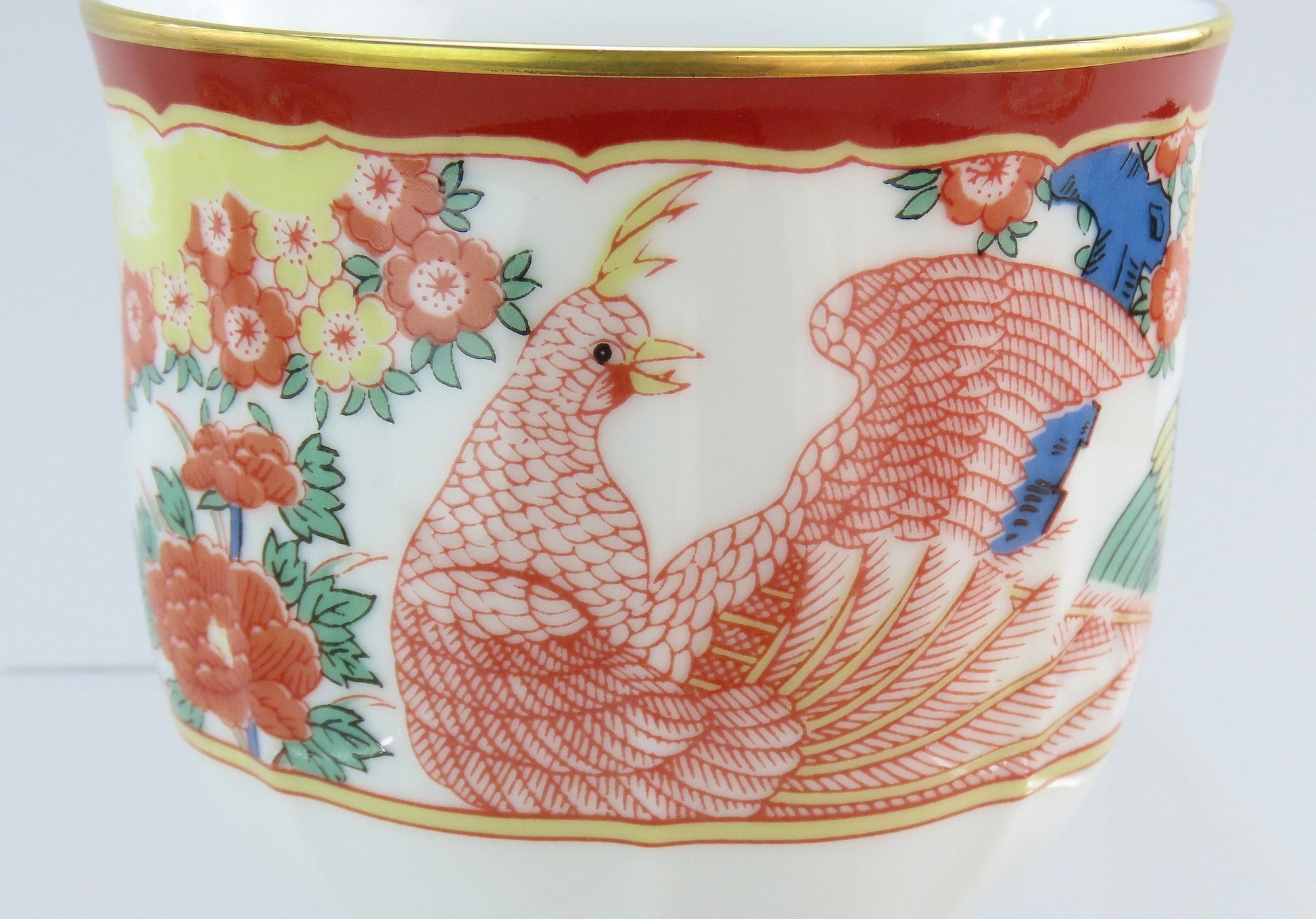 Presented is a fabulous set of 8 large cups and saucers from Gump's San Francisco. This set is in the Phoenix Bird pattern, which was likely in production during the 1990s. The pattern on the saucers displays two birds at the center surrounded by multicolored flowers and a red border with red and green patterned rectangles around the rim. The cups have the center bird decoration around the exterior. Both cups and saucers a soft scalloping detail with bright gilded edges.