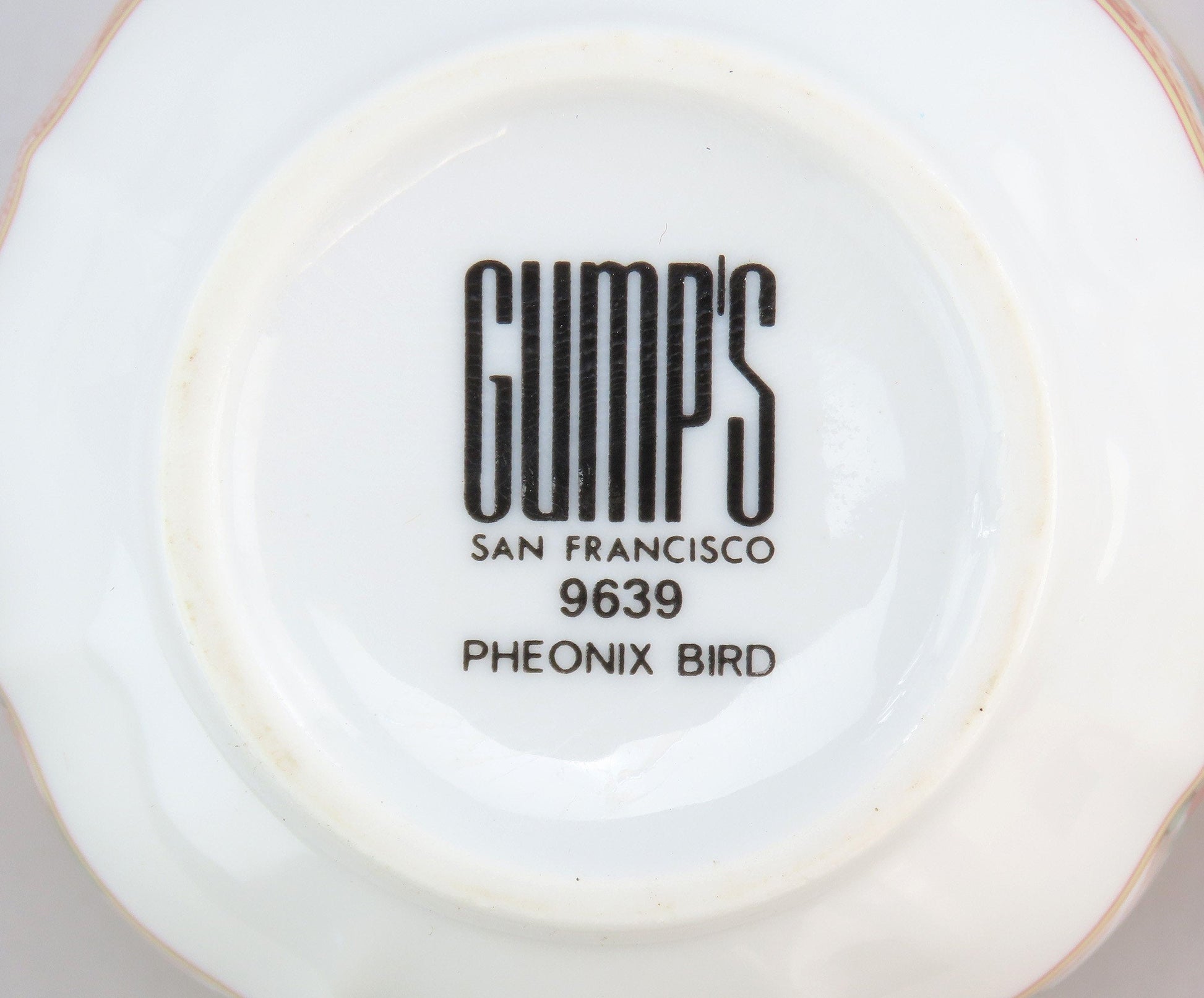 The underside of each piece is marked with the maker's mark for Gump's San Francisco and the pattern information. We have more pieces in this pattern, please view our page for more Gump's Phoenix Bird.