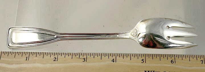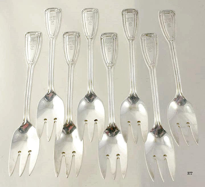 Presented is a set of 8 sterling silver, rare, chipped beef or fish forks of good weight by Tiffany & Company. These are not salad forks, and this type of piece is quite rare and almost never seen These pieces are in the St. Dunstan pattern, which was first made in 1909. Each handle has a threaded design along the edge and nice leave accents near the top surrounding a monogram of the initials KA above the letter S.