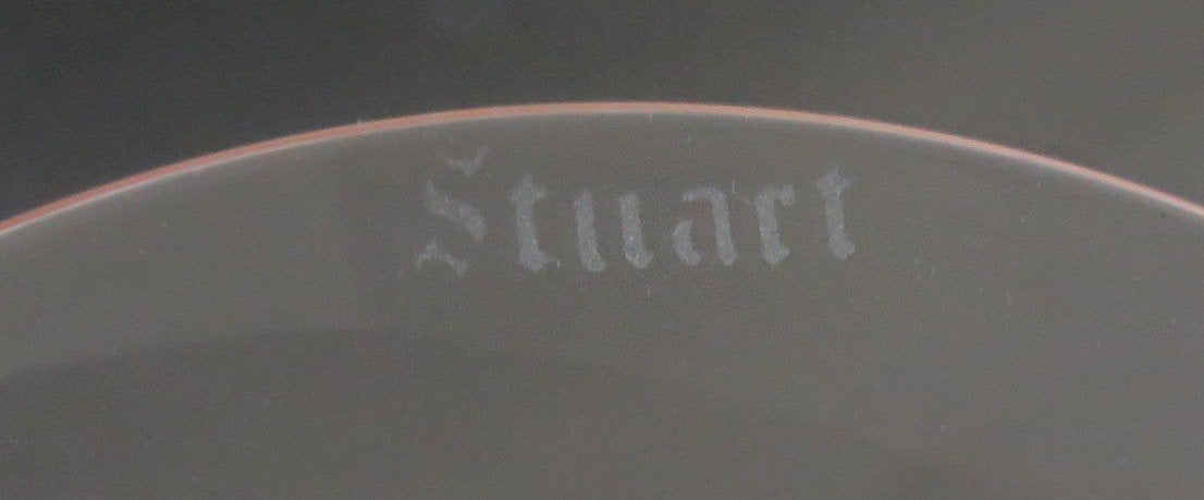 Each glass is marked Stuart. This set is in great overall. One glass has a chip to its base, but there are no other flaws and no repairs.