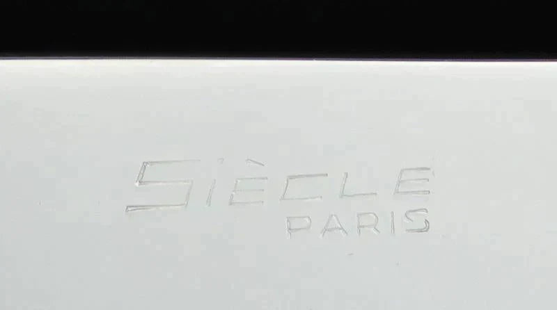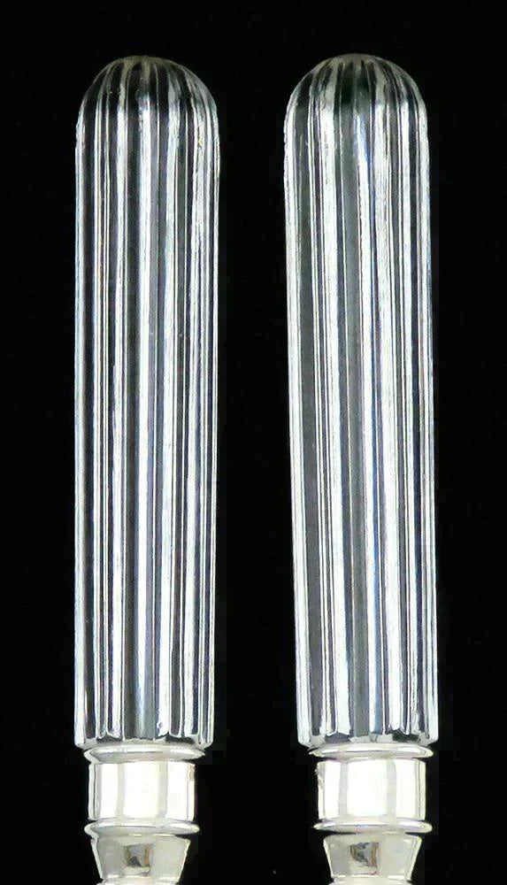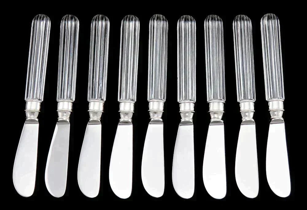 Presented is a fine set of 9 crystal and silver-plated cheese/butter knives or spreaders made by Siecle of Paris. This set is in the Fidelio pattern. Each handle is crystal and done in a ridged form. The collars and blades are silverplate.