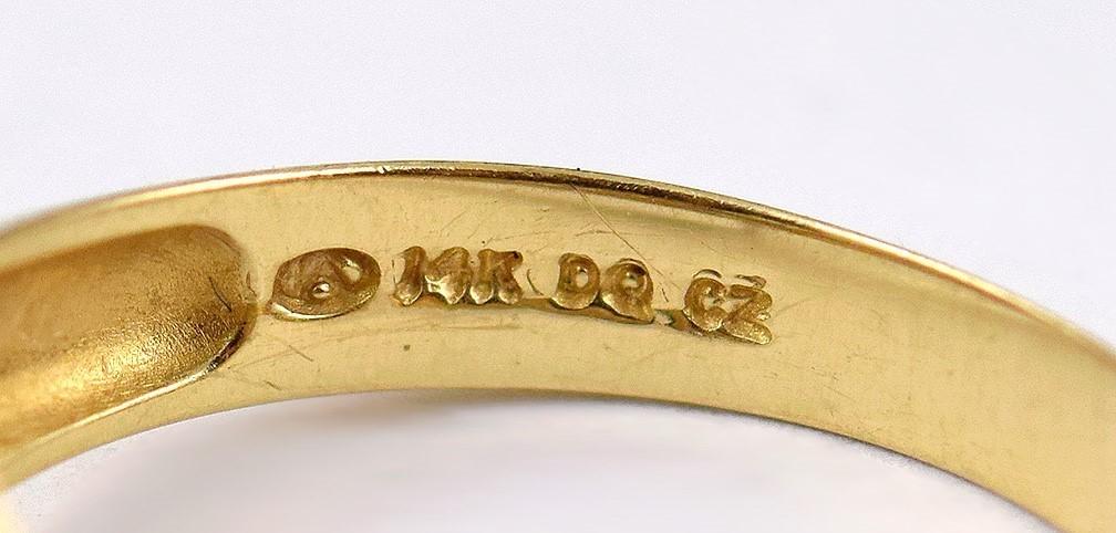 It is marked "14k" for the gold purity. It is also stamped "CZ" for cubic zirconia. There is a maker's mark, as well.
