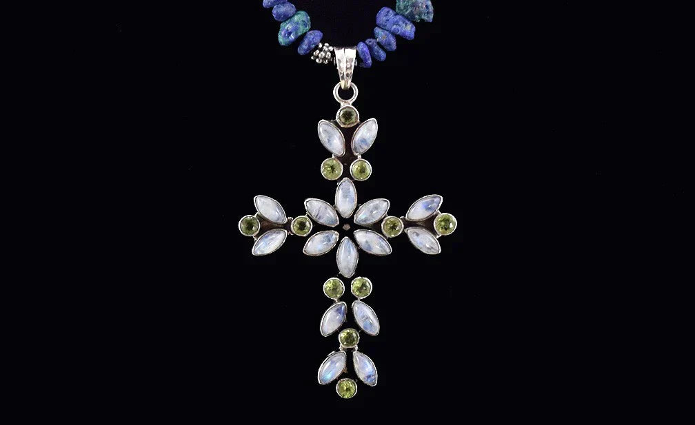 This piece features a central cross that is set with green peridot and adularescent moonstone.