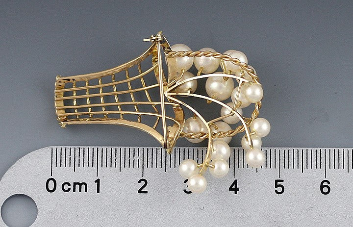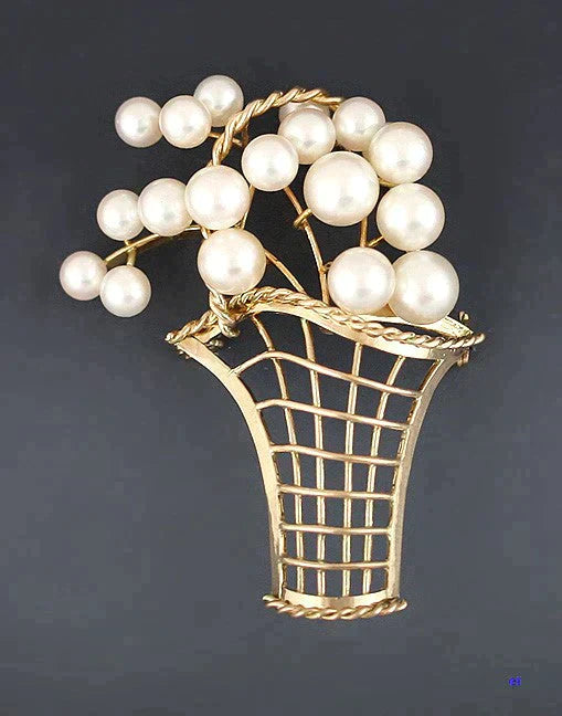 Amazing Quality Pearl 14k Gold Flower Basket Pin Brooch