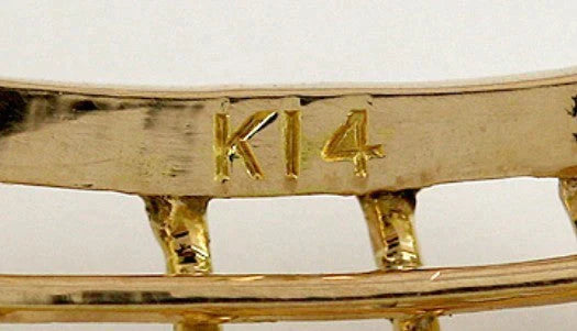 The pin is stamped on the reverse with K14 for 14K gold. Certainly made in Japan in the 1960s to the 1980s. We have tested it with nitric acid and guarantee it to be 14K.