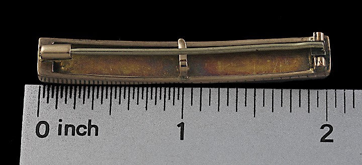 Presented is a pretty American Victorian 10K gold enameled bar pin. The gold is beautifully textured and engraved with black enameling on top in the form of a butterfly, leaves, and other Japanese aesthetic inspired designs. The pin has an old C style clasp. There is also a hook on the back so that you can hang a watch or pendant from the bottom of the pin.