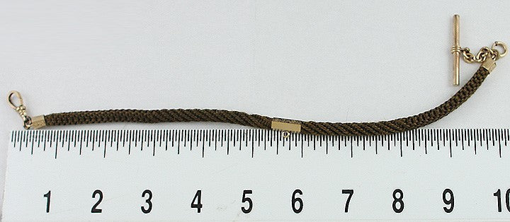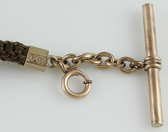 Presented is a remarkable American Victorian hair memorial watch chain. The watch chain is composed of an intricately woven plait of brown hair. There is a piece of 10K gold at the center of the chain, and the ends of the chain are capped in 10K gold. One end of the chain is fitted with a gold filled T bar and spring ring clasp, while the other end is fitted with a gold filled swivel clasp. The three pieces that directly attach to the hair are 10 karat gold, all of the other metal mounts are gold filled/goldplated. This piece was made in America around the mid 1800s, most likely between the 1840s and the 1870s.
