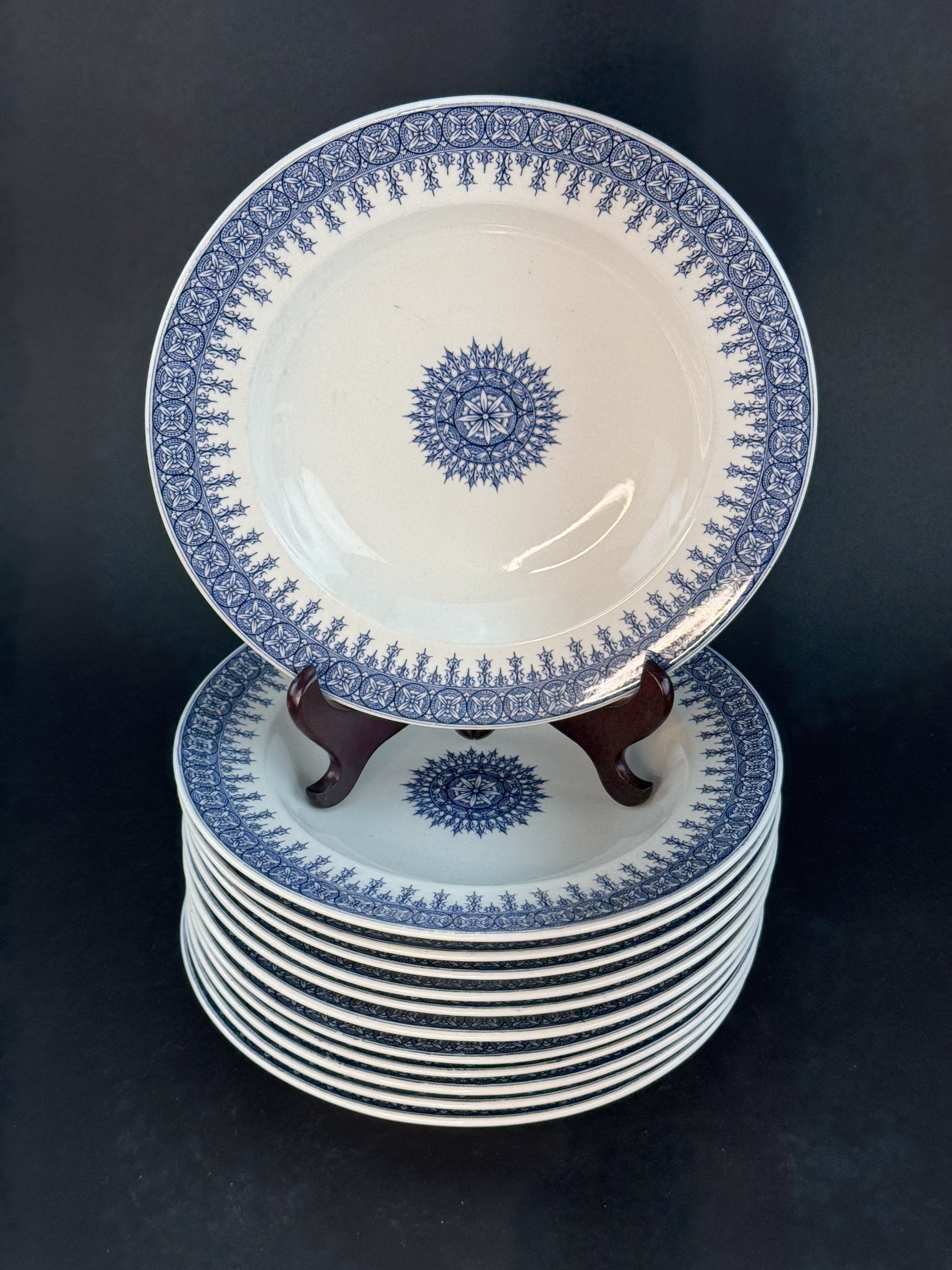 Presented a nice quality set of 11 large wide rim soup bowls made by Royal Worcester of England. The blue and white pattern is quite attractive. Please view all of the photos as they are an important part of the description.. There are 12 bowls shown in the photograph but we only have 11 bowls All of the bowls bear the date letter 'a' corresponding to the year 1890.