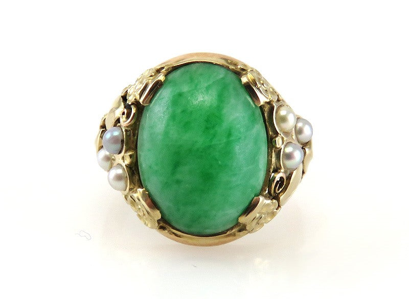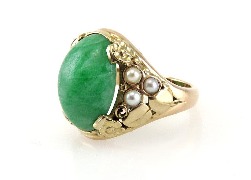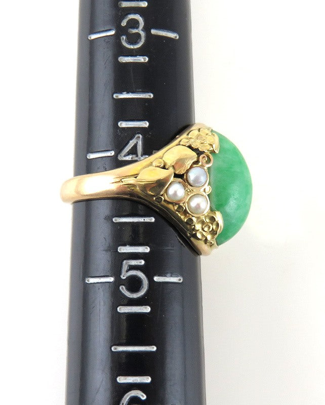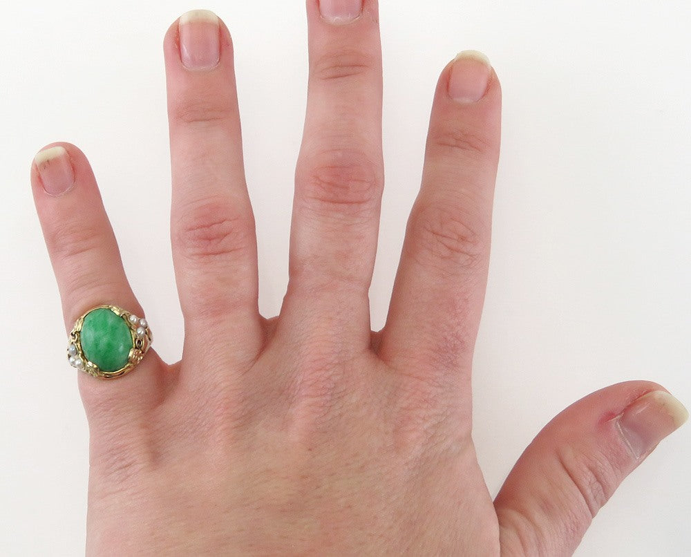 Antique 14K Yellow Gold Natural 6.5 CT Jade Cabochon Pearl Statement Ring