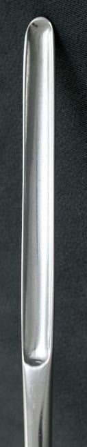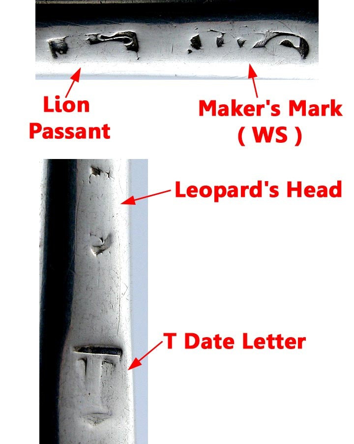 The marrow scoop is hallmarked on the reverse with the lion passant for sterling silver, the leopard’s head crowned for London, the date letter “T” for 1734, and a maker’s mark of WS probably for William Soame. Some of the hallmarks have wear, but they can be clearly identified.