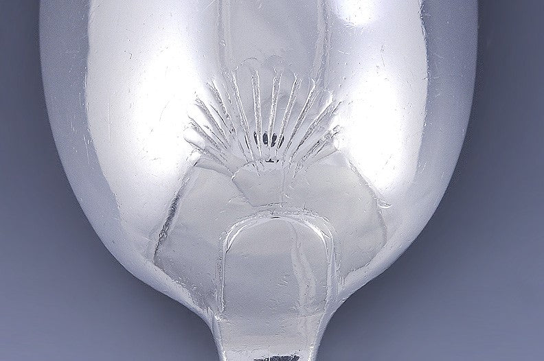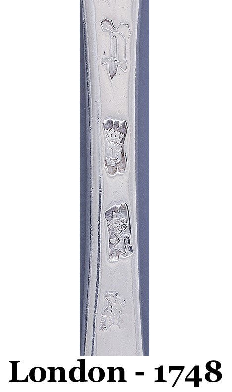 This piece is hallmarked on the underside with the lion passant for sterling silver, the leopard's head crowned for the city of London, a date letter of n for 1748, and a maker's mark for Thomas Jackson.